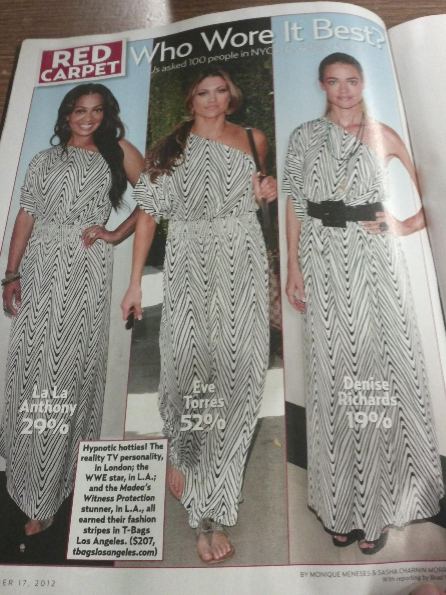 Diva Eve Torres is featured in the "who wore it best" segment of Us Weekly Magazine. Eve won the vote with 52% over actress Denise Richards and tv personality Lala Anthony.